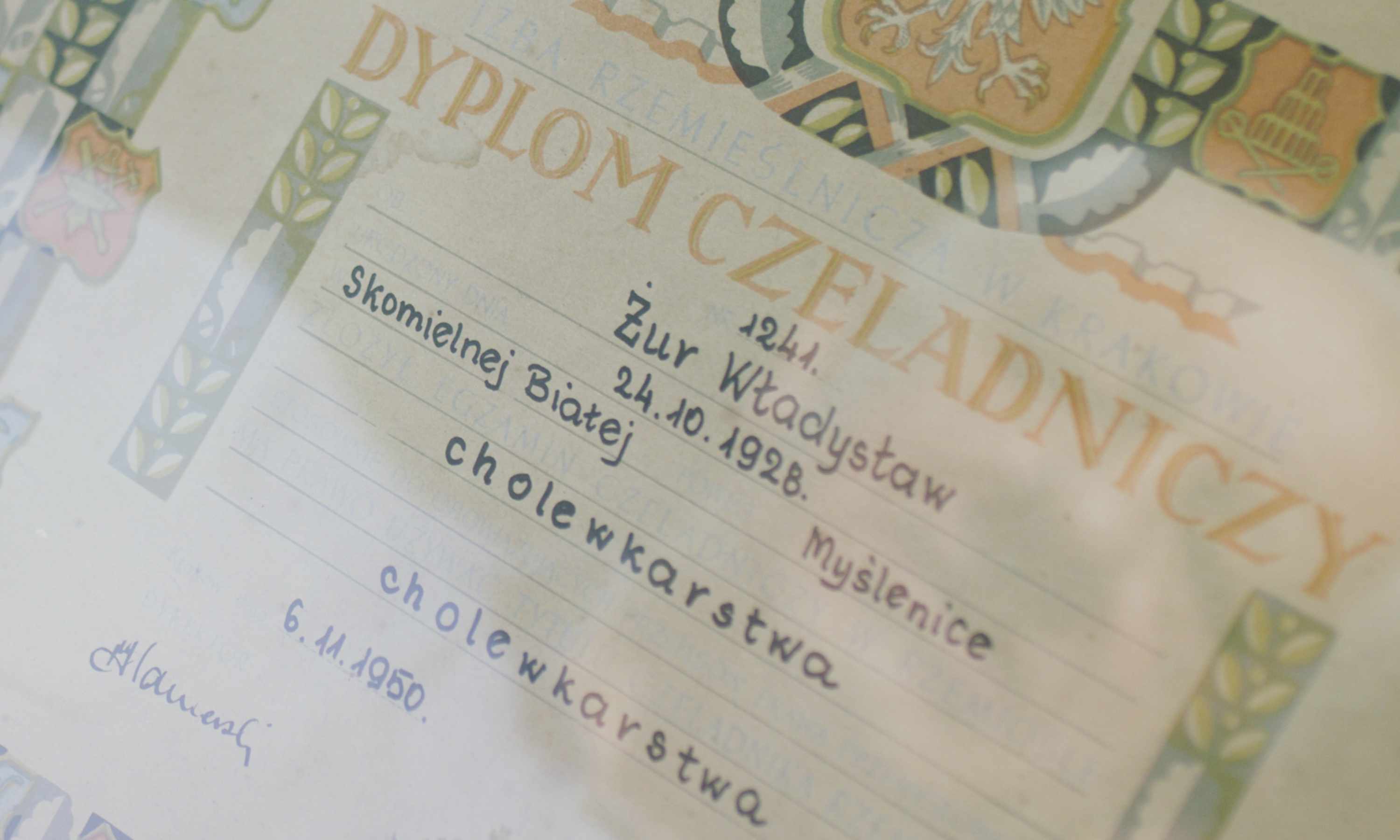 Grandfather Władysław starts his shoemaker training in 1946 to receive his certificate in 1950.